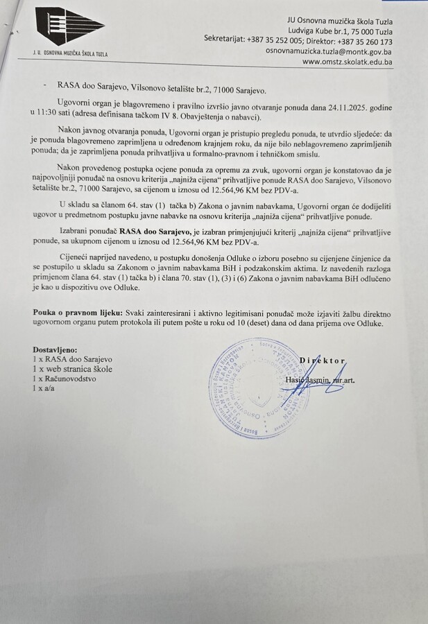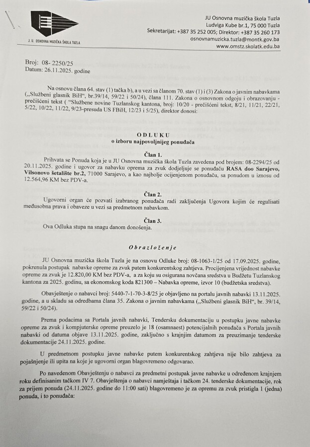 Odluka o izboru najpovoljnijeg ponuđača za nabavku opreme za zvuk