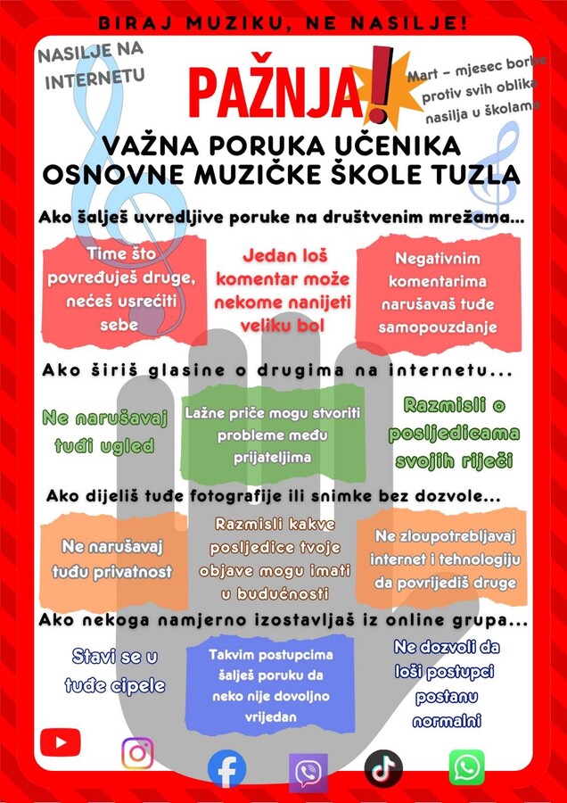 U cilju jačanja svijesti o odgovornoj komunikaciji u digitalnom prostoru, u JU Osnovnoj muzickoj školi održana je edukativna radionica na temu "Digitalna komunikacija i emocije kao faktor prevencije cyber nasilja među učenicima" koju su realizovali pedagogica škole Lejla Ćatić Mumić i profesori škole Ena Đokić, Jasmin Osmić i Darko Gajić.